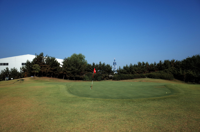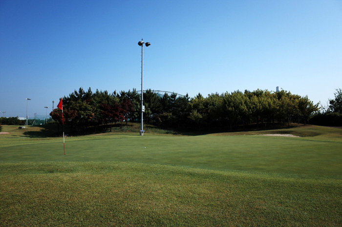 입구에 퍼팅 연습장이 위치하고 있으며, 전체적으로 넓은 평지에 구성되어있는 골프장의 모습도 확인할 수 있다.