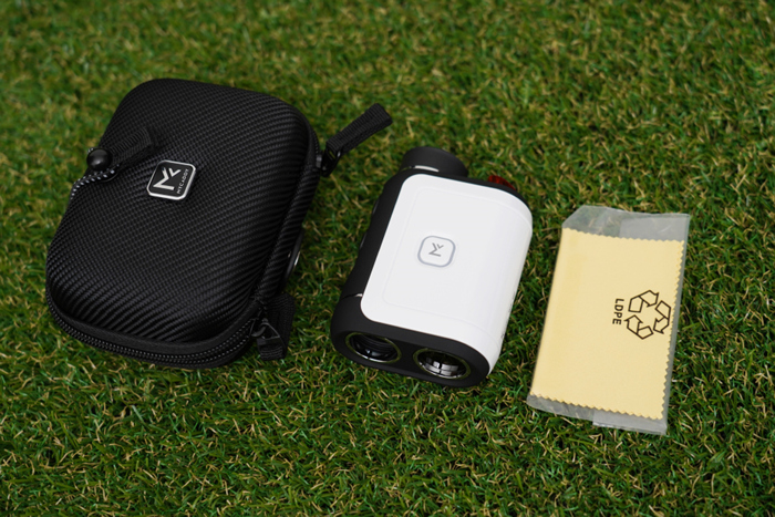 하이글로시 소재에 블랙&화이트로 깔끔한 느낌의 디자인을 갖추고 있다. 왼쪽에는 고저차를 감안하여 보정해주는 슬로프 버튼이 위치하고 있으며, 기능을 끄면 골프 대회에서도 문제 없이 사용할 수 있다. 상단에는 전원과 모드 버튼이 위치한다.