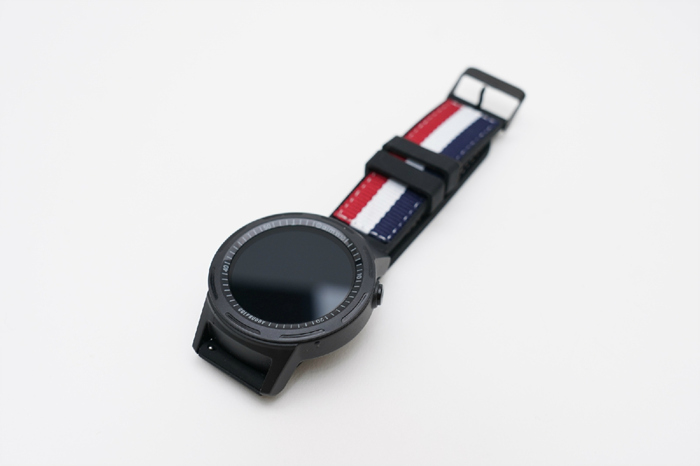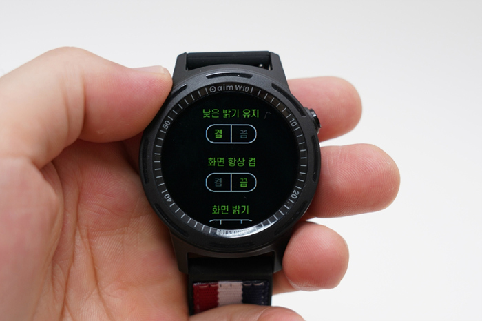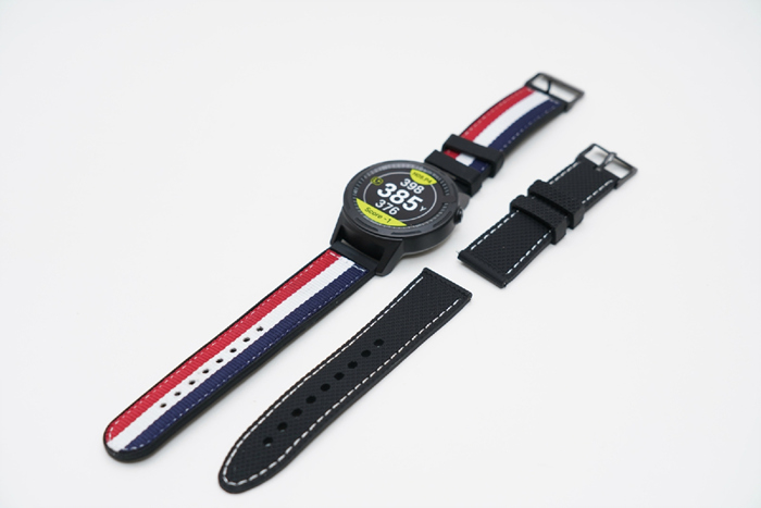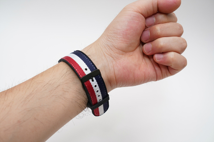 손목에 착용해본 모습. 세 가지 색깔로 클래식하게 구성된 패션 스트랩은 멋스러운 느낌을 더해준다.