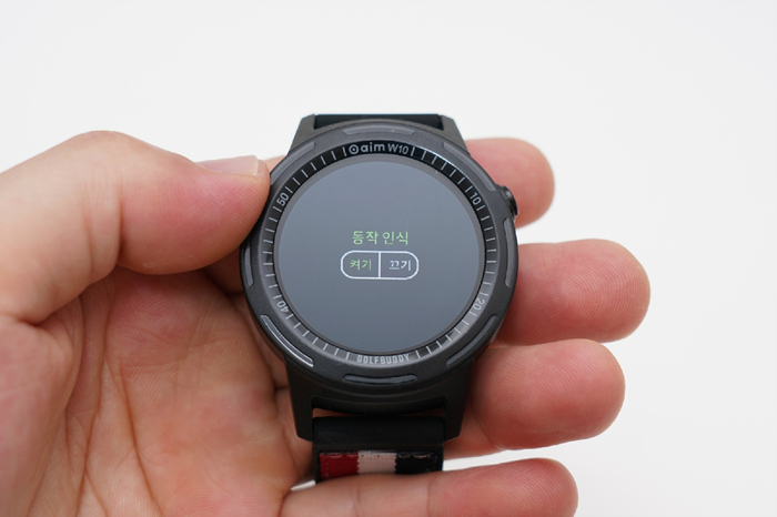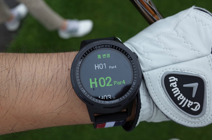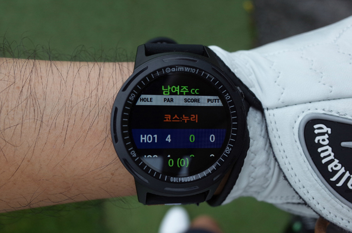 골프버디 aim W10을 착용하고 필드 라운드를 진행해보았다. 클럽하우스에 도착해 전원을 켜고 플레이골프를 선택하면 GPS 위치를 통해 골프장이 자동 선택되고 티오프 상태로 전환된다.