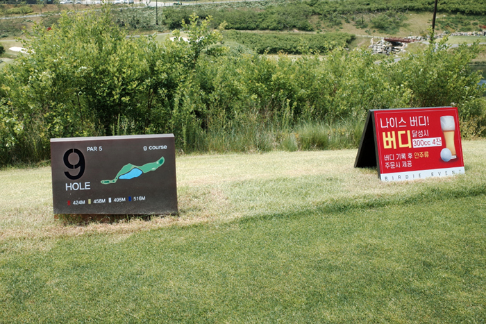 G코스 마지막 9번홀. 495m 길이의 파5홀로 200m 이내로 드라이버 티샷이 떨어지면 해저드가 될 수 있어 부담이 상당하다. 거리를 넘기더라도 좌측에 큰 해저드가 있어 거리와 방향 모두 중요한 G코스 핸디캡 1번홀.