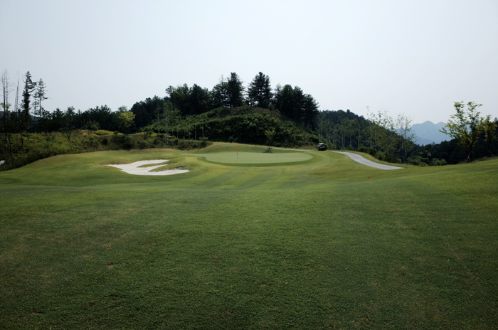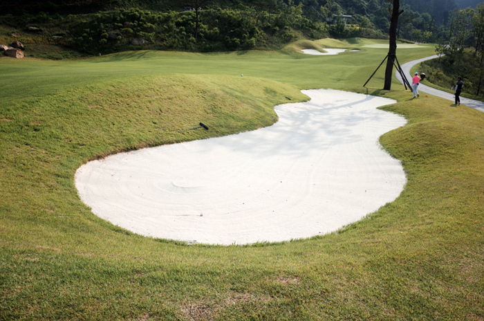 힐코스 5번홀은 325m 거리의 파4. 그린 좌측에 큼직한 벙커가 위치하고 있다. 고운 모래의 백사장을 보는듯 벙커 관리 상태도 매우 좋았다.