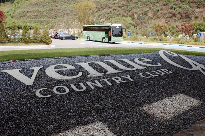 가평 베뉴지CC의 클럽하우스와 주차장. 오픈한지 얼마 되지 않아 시설이 모두 깔끔하다.