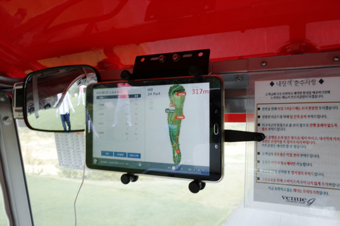 카트에 설치되어있는 태블릿 PC를 이용해 코스 전체의 구성과 공략 방법을 확인할 수 있으며, 스코어가 기록된다.