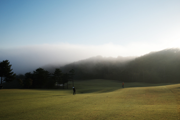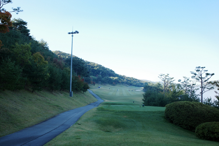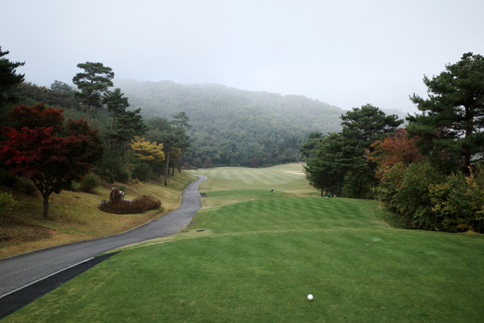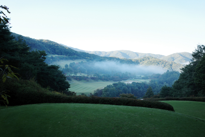 해가 뜨고 시간이 조금 지나니 안개가 거의 걷혀간다. 여강코스 1번홀은 280m 길이의 파4홀에 내리막으로 편안한 곳이다.
