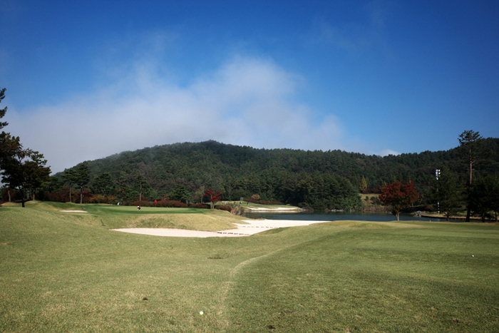 소피아그린CC에서 가장 좋아하는 여강코스 3번홀. 산과 나무, 쭉 뻗은 페어웨이와 새하얀 벙커, 해저드까지 한눈에 들어오는 멋진 곳이다. 내리막을 감안해 티샷은 200m 정도로 짧게 공략하는 것이 좋다.
