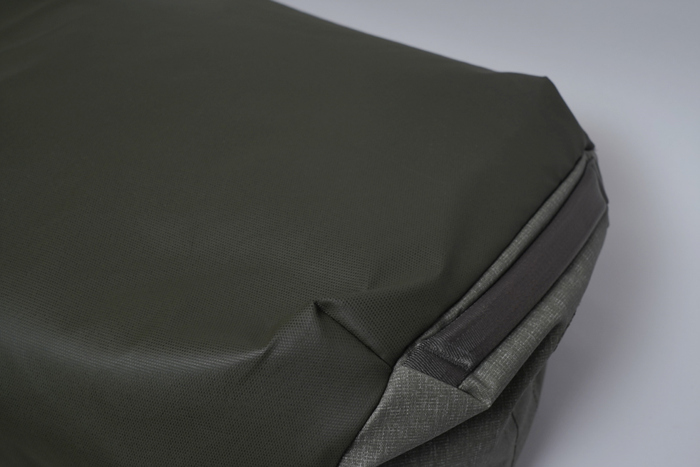 바닥면은 방수 처리되어 있는 모습을 확인할 수 있으며, 측면쪽에는 백팩 타입으로 착용 시 활용할 수 있는 손잡이가 구성되어 있다.