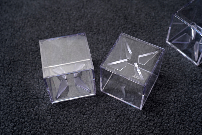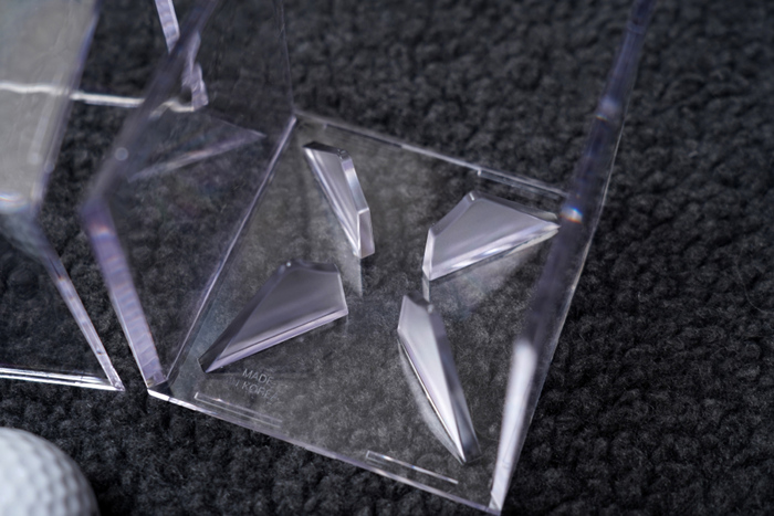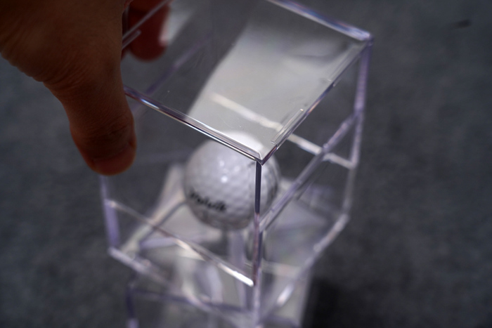 케이스는 상단으로 들어 올려 열고 닫을 수 있다. 투명 아크릴로 구성되어 어느 방향에서도 내부에 수납해놓은 공을 확인할 수 있다.