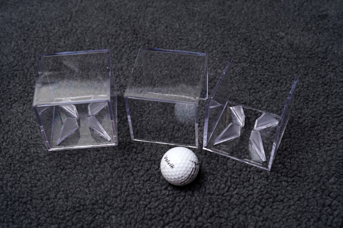 슬라이드 형태로 열고 닫을 수 있으며, 바닥의 받침대 위에 안정적으로 골프공을 거치할 수 있다.
