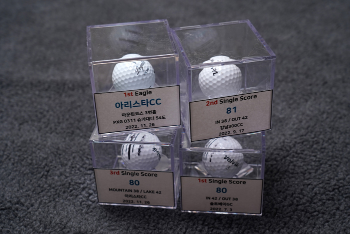골프 관련 기념품을 모아둔 모습. 싱글 스코어와 이글 기념구를 MAB 아크릴 케이스에 보관했다. 2023년 시즌에도 기념구를 보관할 일이 생기길 기대하며 리뷰를 마친다.