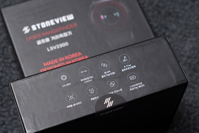 스톤뷰 LSV2300 레이저 골프거리측정기는 박스 패키지에 MADE IN KOREA 문구가 큼직하게 새겨져있다. 색상은 블랙/화이트 두 가지로 출시되었다.