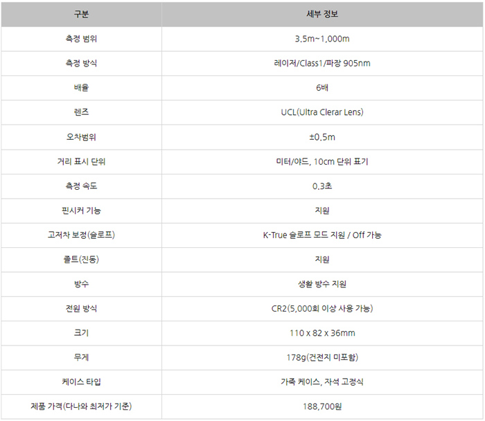제품 사양을 살펴보면 3.5~1,000m 측정이 가능하며, 6배율 UCL 렌즈가 탑재되었다. K-True 슬로프 모드를 지원하여 고저차가 있는 지형에서 보정거리를 제공하며, 졸트와 생활방수 등 기본기를 모두 갖추고 있다. 가격대 또한 준수한 편으로 차쉬넬을 고려하고 있는 골퍼라면 검토해볼만하다.