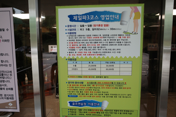 안산 제일CC 파3는 회원제 골프장 옆에 구성되어있어 지금까지 다녀본 모든 파3 골프장 중에 관리 상태가 가장 좋아 만족스러운 곳이다. 영업 시간은 일출-일몰에 따라 변경되니 문의해보는 것이 좋으며, 9홀 라운드 비용은 평일 2만원대, 주말 3만원대로 부담이 없다.