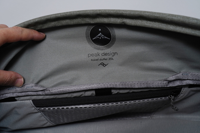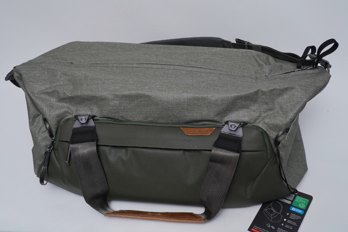 바닥면은 방수 처리되어 있는 모습을 확인할 수 있으며, 측면쪽에는 백팩 타입으로 착용 시 활용할 수 있는 손잡이가 구성되어 있다.