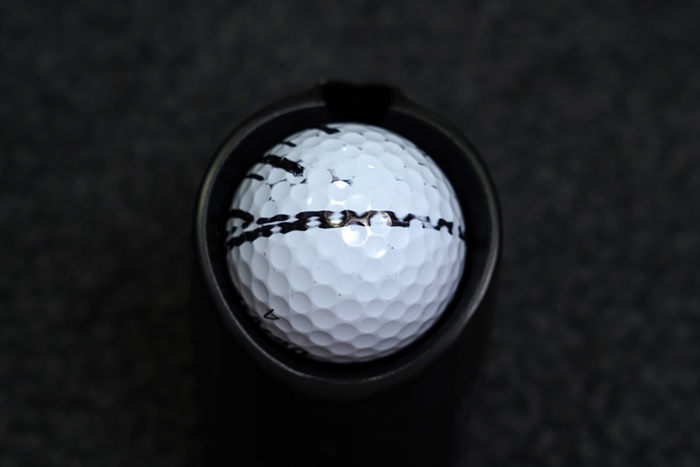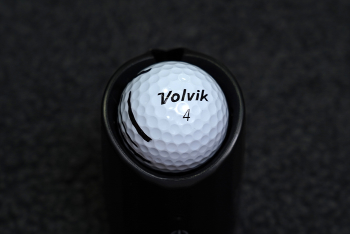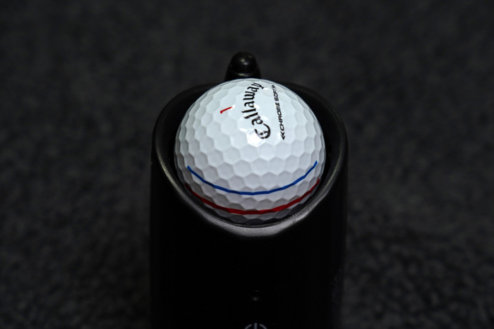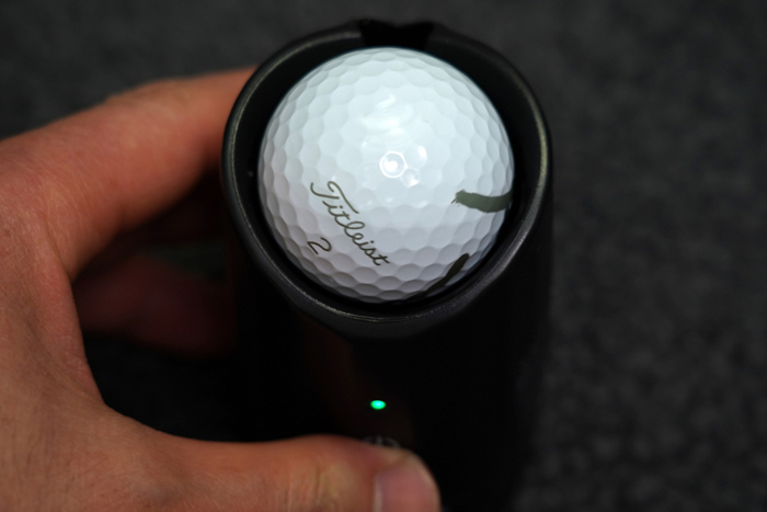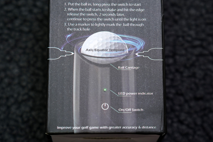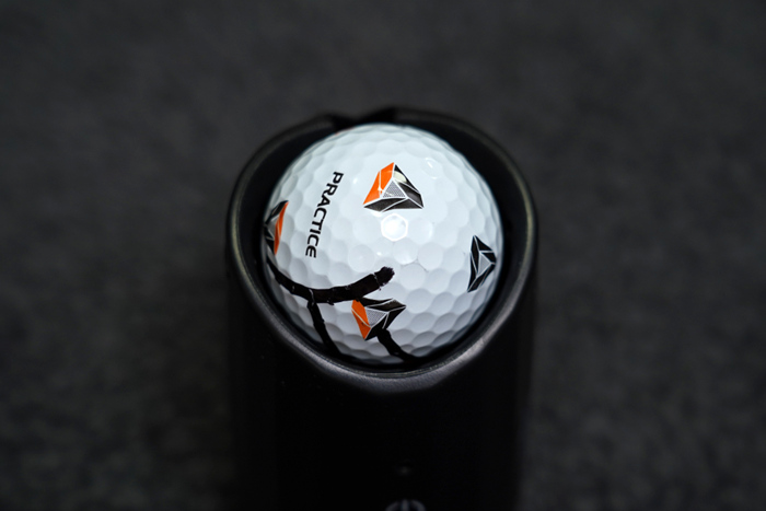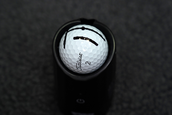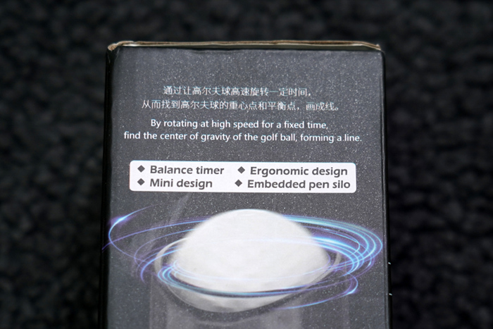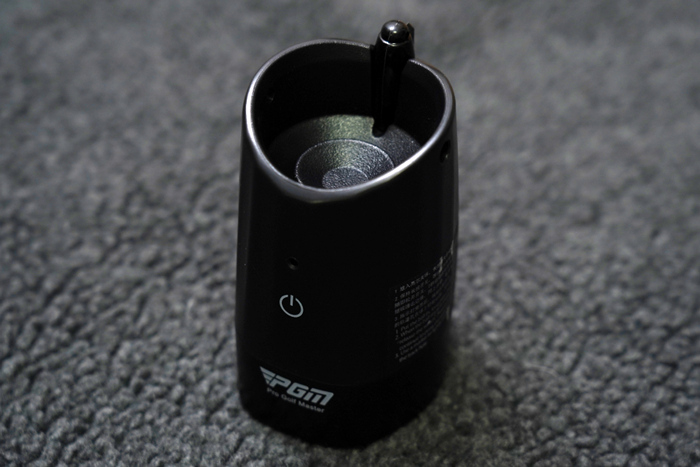 골프공보다 약간 넓은 폭의 컴팩트한 모습을 확인할 수 있다. 상단에는 골프공을 올려 회전을 시키는 부분이 받침대 형태로 구성되어있다.