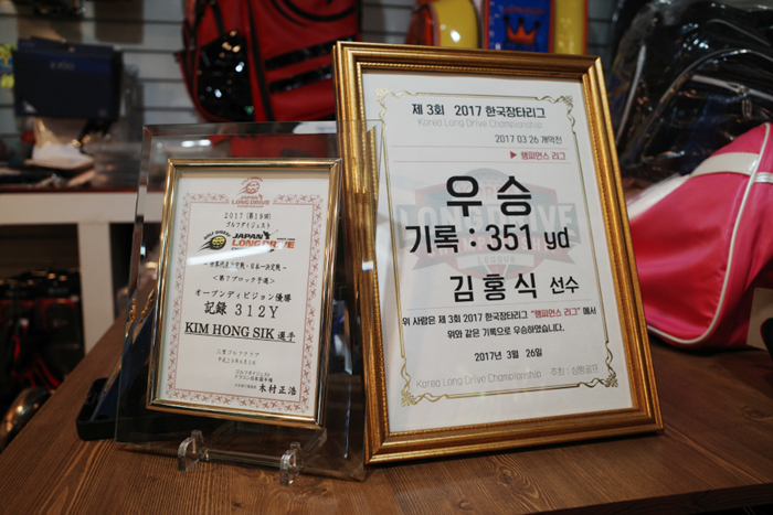 캐디백에 드라이버만 잔뜩 들어있는 장타선수만의 특별한 모습. 한쪽에는 장타대회의 상패가 전시되어있다. 일반적인 골퍼는 상상도 할 수 없는 351야드의 기록이 놀랍다.