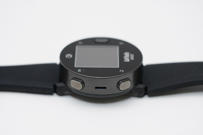 왼쪽의 버튼 사이에 스피커가 위치하고 있으며, 음량이 상당한 편이라 코스 이동과 현재 플레이 중인 위치 기반으로 다양한 정보를 음성으로 안내해주는 것이 편리하다. 오른쪽에는 고무 커버로 충전 단자가 보호되어있는 모습을 확인할 수 있는데, 마이크로 USB 5핀으로 스마트폰 충전기 또는 보조 배터리를 이용해 어디서나 편리하게 충전할 수 있다.
