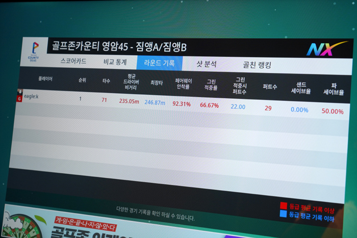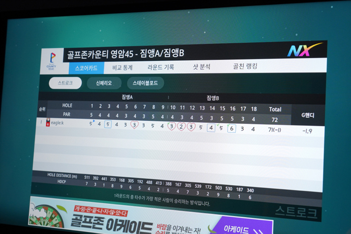 골프존파크 투비전NX 스크린에서 플레이한 골프존카운티 영암45 짐앵A/짐앵B 코스는 1언더파로 다소 아쉬운 스코어를 기록했다. 평지에 넓어서 쉽게 플레이할 수 있지만 페어웨이의 분화구 모양 벙커에 빠지면 높은 탈출각이 필요해 레이업을 먼저 해야하는 1타 추가 플레이에, 그린의 경사도가 상당해 만만하게 보긴 어려운 코스라고 생각된다. 후기를 마친다.