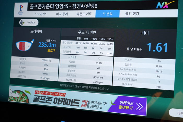 집 근처와 주변에 즐겨찾는 대부분의 스크린 골프장이 투비전NX로 시스템을 변경해 주렵으로 플레이하고 있다. 골프존카운티 영암45CC는 세 가지의 코스 조합으로만 플레이가 가능하며, 모두 코스/그린 난이도 별 4개로 구성되어 홀인원 상금에 조건이 붙는 난이도 부분에서 문제 없이 이용할 수 있다.