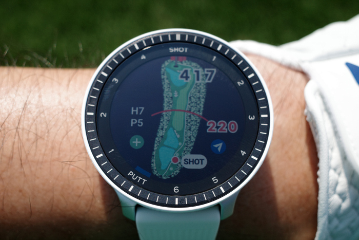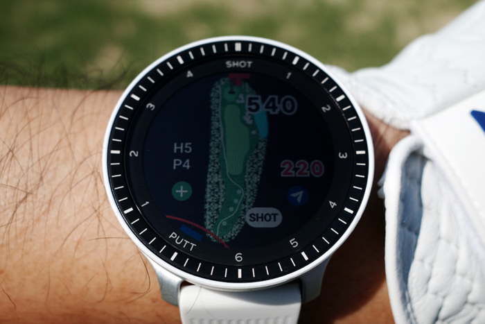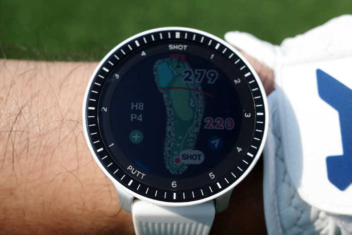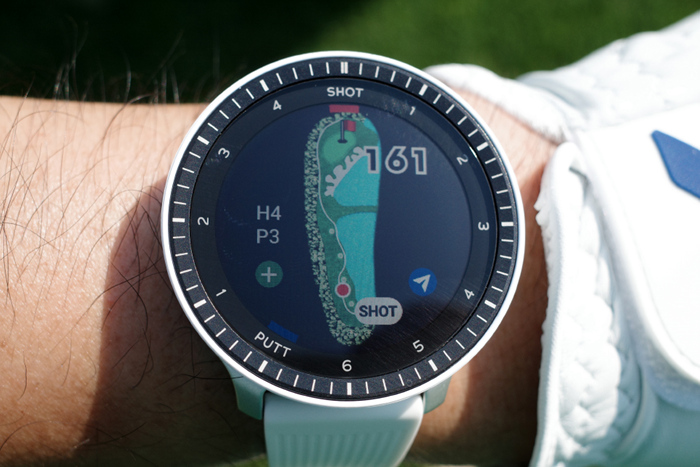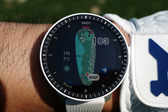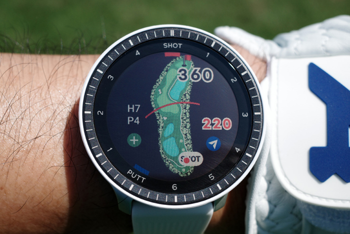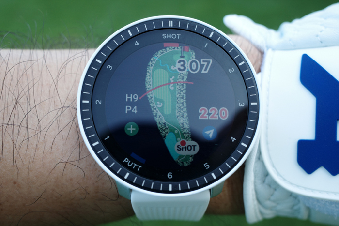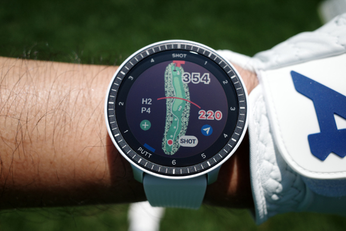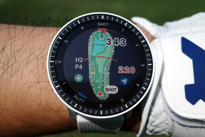 후반은 레이크 코스로 진행되며 1번홀은 342m 파4. 워치는 GPS 위치 오류로 거리가 잘못 표기되었다.