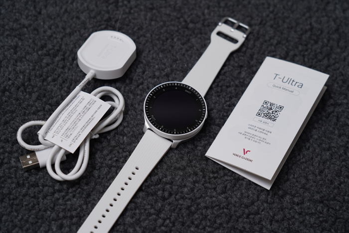 전체 구성품의 모습. 본체, 충전 크래들, 사용 설명서가 제공된다.