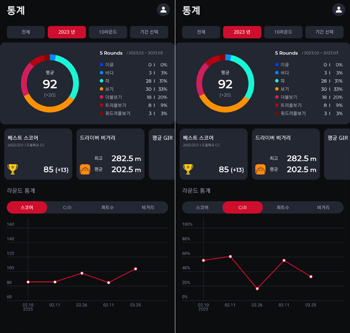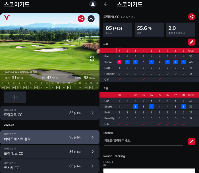 보이스캐디를 사용해 필드 라운드를 진행하면 자동으로 기록되는 샷 데이터와 이를 기반으로 간편하게 입력한 스코어를 통해 마치 스크린 플레이와 같은 세부적인 데이터를 기록할 수 있어 매우 유용하다.