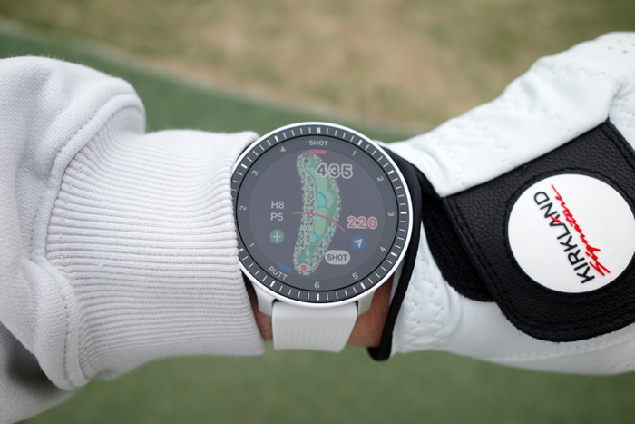 손목에 착용해본 모습. 스트랩이 내부로 수납되는 구조로 덜렁거림 없이 편안하게 필드 라운드가 가능하다.