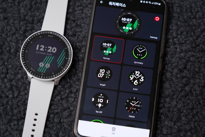 스마트폰의 보이스캐디 어플과 연동하면 워치페이스를 비롯해 펌웨어 업그레이드와 다양한 설정이 가능하다.