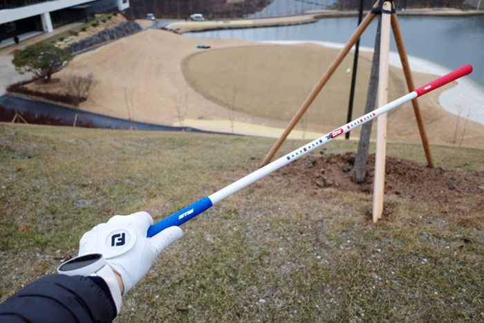 기본 그립은 파란색에 얇고 긴 타입으로 장착되어있으며 기본 그립으로 사용 시 팔안쪽 부분에 닿는 면적과 느낌이 약간 아쉬워 더욱 두껍고 반달 모양의 형태로 어드레스와 그립감이 더 안정적인 점보맥스 17인치 그립을 장착했다. 그립 구매 및 교체 비용은 5만원정도가 소요되었다.