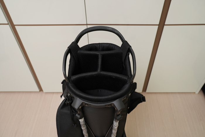 슬림한 스타일이다보니 4분할로 분할 갯수는 적으며, 입구는 9인치, 무게는 2.8Kg이다. 드라이버부터 퍼터까지 14개의 클럽을 모두 수납하는데에는 문제가 없다.