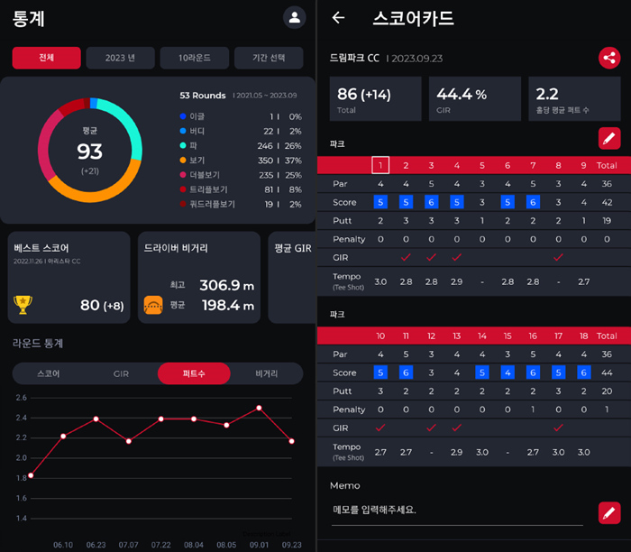 안정적인 퍼팅을 기반으로 스코어 또한 G핸디에 비해 매우 좋게 기록되었다. 계속 사용하며 적응하면 스크린 뿐만 아니라 필드 라운드에서도 좋은 결과를 만들 수 있으리라 생각된다.