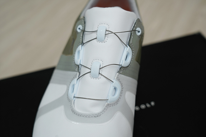 깔끔한 화이트 컬러에 측면에 실버 포인트가 더해져 부담스럽지 않고 멋스러운 느낌. 보아 시스템은 발꿈치쪽이 아닌 발등 윗쪽에 위치하여 편리하게 접근하고 제어할 수 있다.