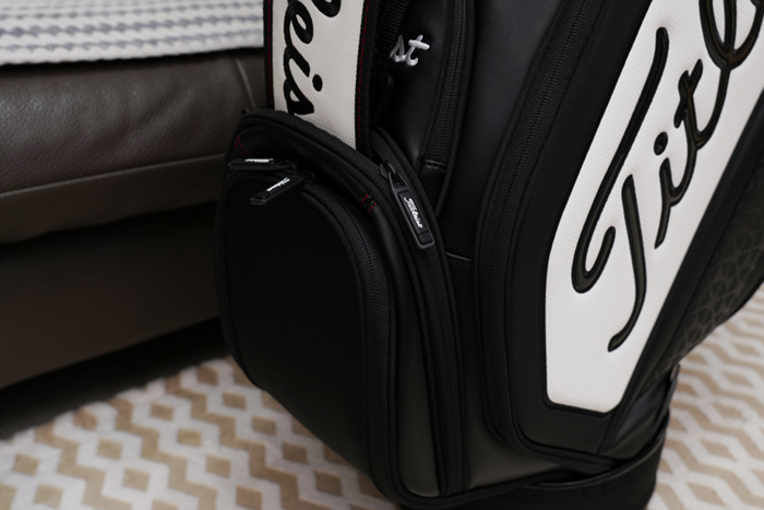 신발 주머니는 양 측면의 지지대를 통해 각을 유지하여 수납이 편리하며, 상단부는 메쉬로 구성되어 통풍에도 용이하다. 연습장이나 스크린, 필드 라운드를 하다보면 발에 땀이 차며 내부도 젖을 수 있는데, 이렇게 메쉬로 구성된 주머니 덕분에 보관 중에도 쾌적하게 관리할 수 있다.
