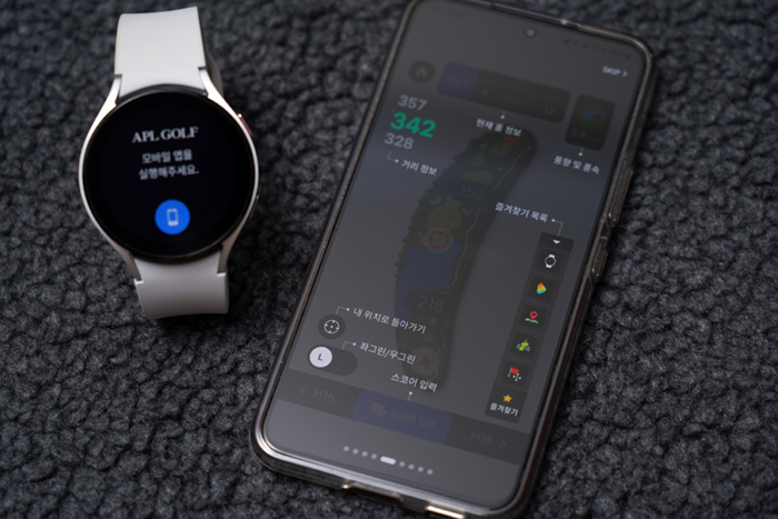 갤럭시 워치4와 연동하면 워치를 통해 남은 거리를 확인할 수 있다. 보이스캐디의 실시간 핀위치 기능인 APL이 적용된 거리로 코스 공략에 매우 유용하다.