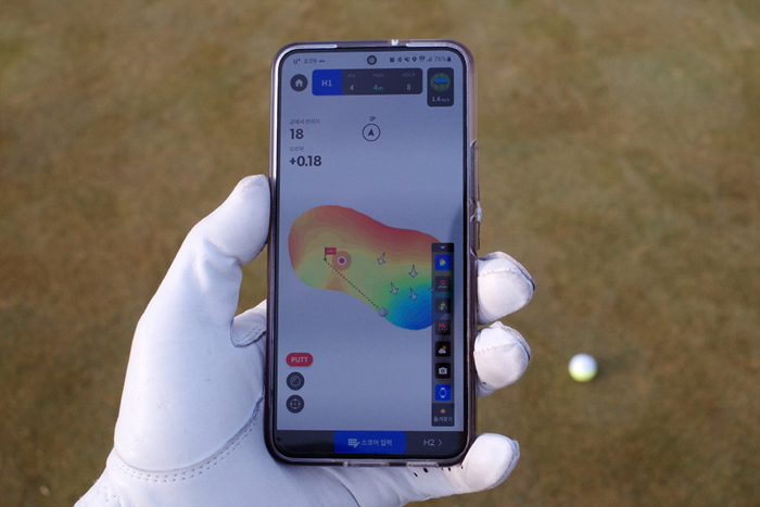 그린 위에서는 현재 공 위치부터 핀까지의 퍼팅 거리도 확인할 수 있으며, 경사도가 마치 스크린골프를 보는듯 표시되기에 퍼팅 방향을 에이밍하는데에도 유용하다.