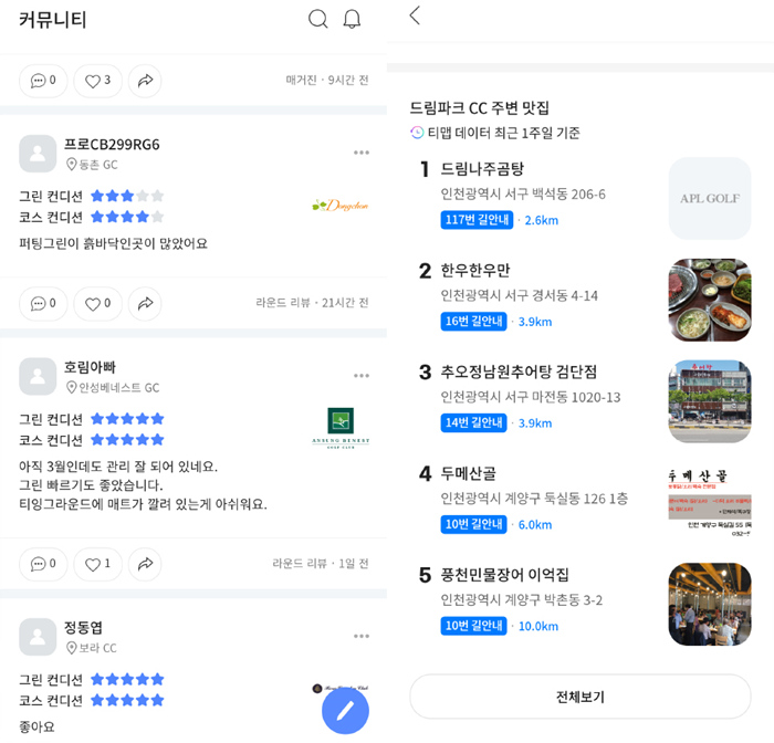 라운드를 진행한 유저들의 후기를 커뮤니티를 통해 확인할 수 있으며, 라운드 전 후 식사를 위한 주변 맛집 정보까지 있어 매우 유용하다.