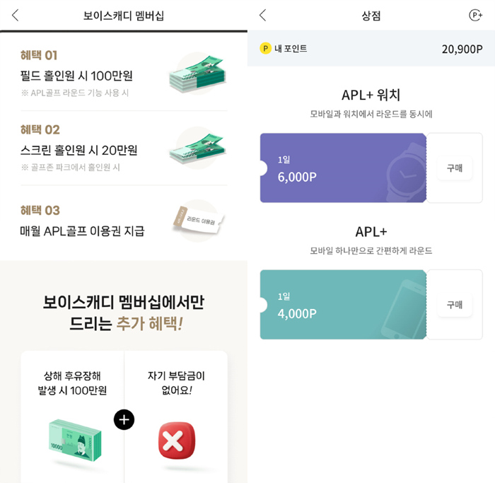 보이스캐디 멤버십을 가입할 수 있으며, 필드/스크린 홀인원 시 상금 지급과 APL 골프 이용권 지급혜택이 있다. 스마트폰으로 라운드 사용 시 4000포인트, 워치까지 같이 사용 시 6000포인트가 필요하다.