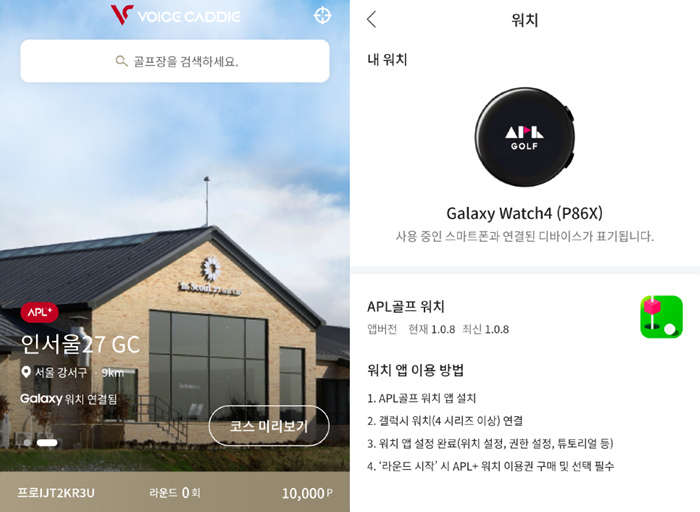 가까운 골프장이 먼저 보여지며 갤럭시워치4 스마트워치와도 연결된 것을 확인할 수 있다.