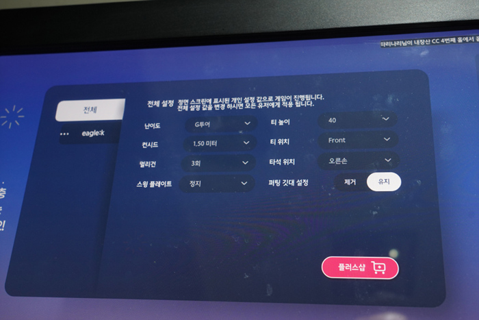 그린 스피드는 2.4~3.9m 까지 지원하며, 0.3m 단위로 변경할 수 있다. 보통 필드에서 2.4 내외의 그린스피드를 자주 만날 수 있으며, 미리 연습하고자 하는 골프장의 스피드 정보를 활용해 라운드 전날 연습한다면 도움이 되리라 본다.