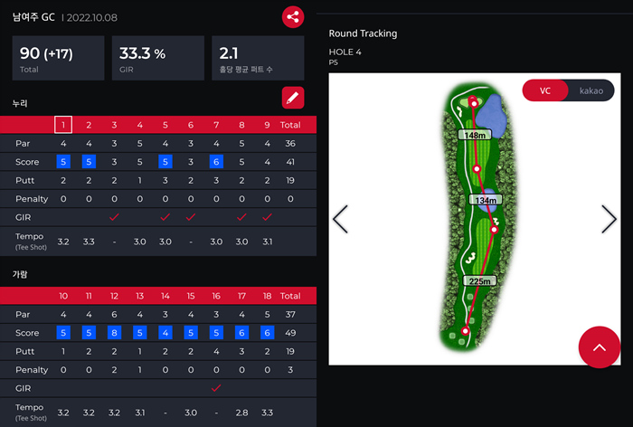 골프버디 aim L20과 함께 플레이한 이번 라운드는 55%의 GIR를 기록했다. 10번에 달하는 버디찬스를 만들 수 있었던 것은 역시 정확한 거리 확인을 통한 클럽의 선택과 자신감이다.
