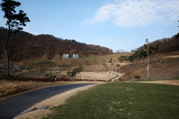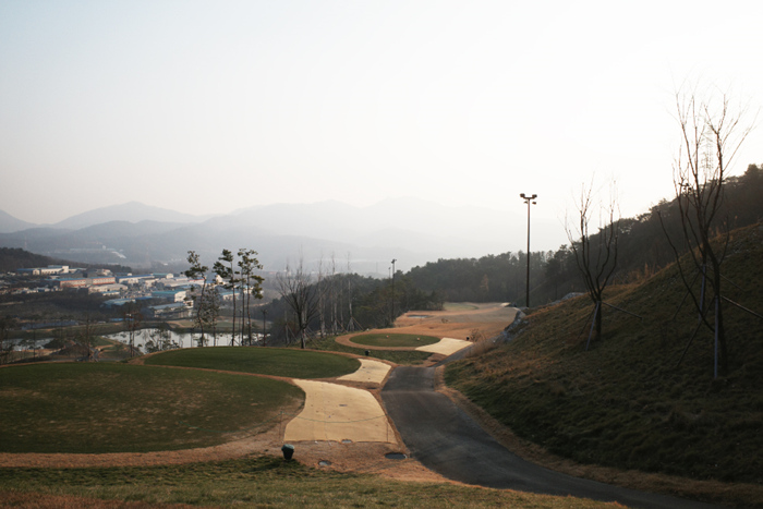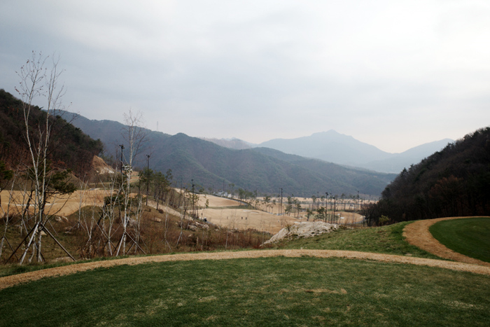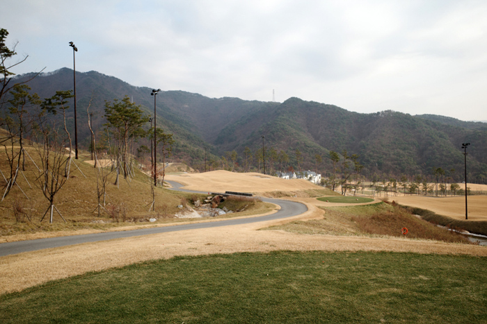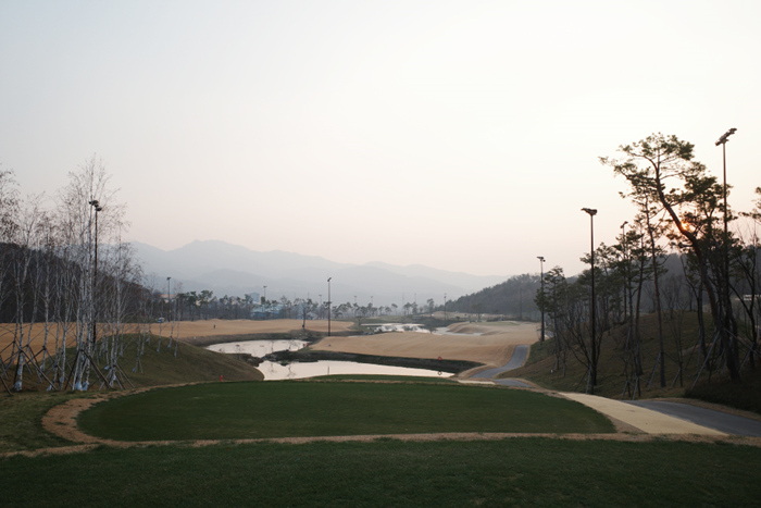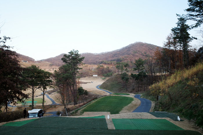 클럽하우스 옆에 구성된 연습 그린의 모습. 스타트 지점에서 전체 전경이 한눈에 들어오는데 산악지형에 코스도 상당히 좁은것을 확인할 수 있다.