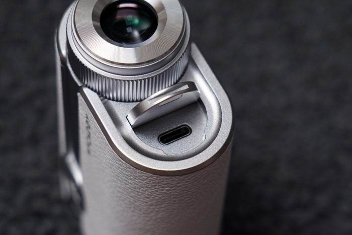 접안렌즈에는 시도 보정 다이얼이 구성되어있으며 제품 충전 시 측면의 로고에 LED가 점등되어 충전 상태를 확인할 수 있다. USB TYPE-C 충전방식으로 CR2 배터리를 사용하는 제품들에 비해 방전 시에도 보조배터리나 휴대폰 충전기를 이용해 쉽고 빠르게 충전할 수 있다.