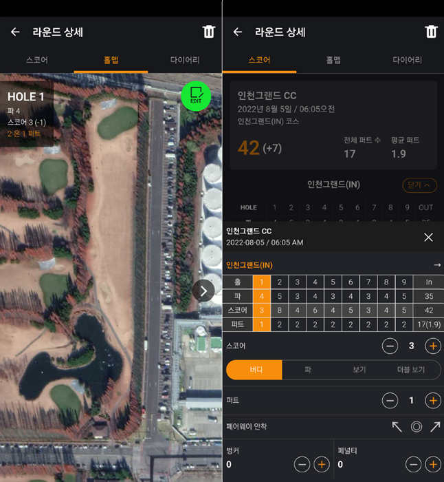 스마트캐디 어플을 이용해 필드 라운드를 진행해본다. 현재 GPS 위치정보를 기반으로 골프장과 홀 번호를 자동으로 인식하여 편리하다.