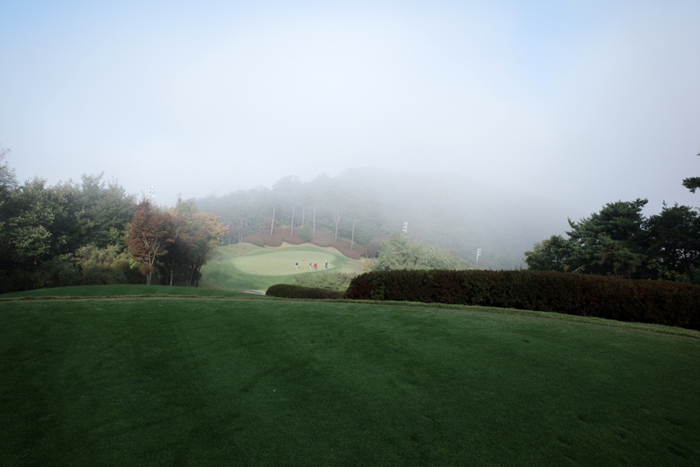 세종 코스 7번홀은 파5 399에 좌도그렉 구성이다. 높은 지대이다보니 안개가 주변에 가득하다.