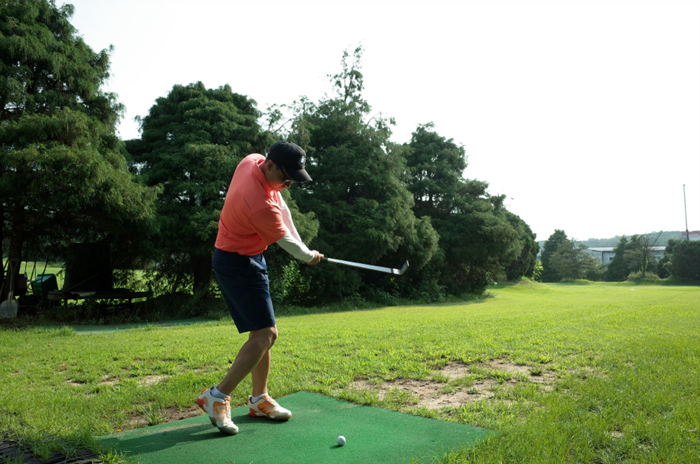 첫홀 연습 스윙 중인 멤버들의 모습. 8월의 무더위에 반바지와 반팔 차림이며, 딱히 복장 규정은 없으니 편하게 입으면 된다.