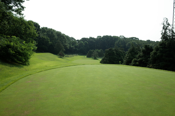 77야드의 6번홀. 티샷 지점의 옆쪽으로 다른 홀의 그린이 구성되어있기에 타구 사고에 유의해야한다.