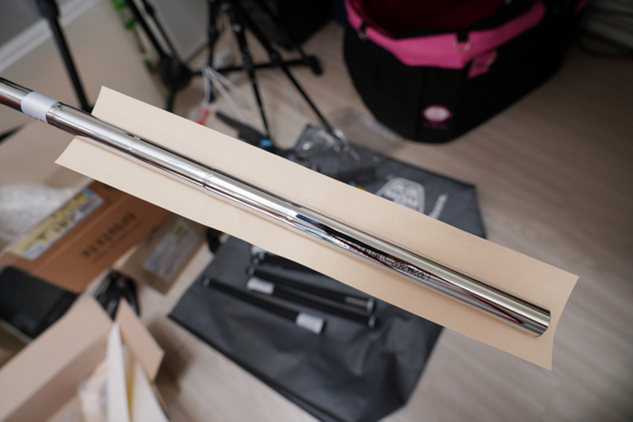 샤프트의 끝부분으로 약 1cm 정도 남도록 부착한 후에 끝쪽을 샤프트 안쪽으로 말아주면 샤프트 내부로 이물질이 들어가는 것도 방지할 수 있어 이렇게 양면테이프 부착을 추천.