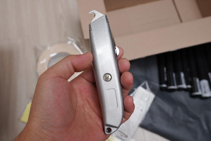 기존에 장착되어있던 그립을 제거하기 위한 후크 커터. 칼 끝부분이 후크 모양으로 구성되어 일반 커터칼을 사용하는 것보다 훨씬 편리하다.