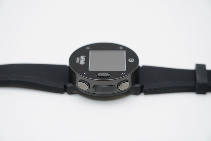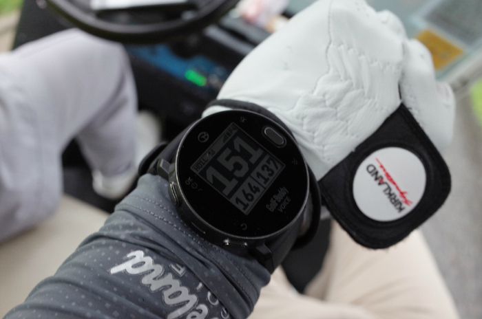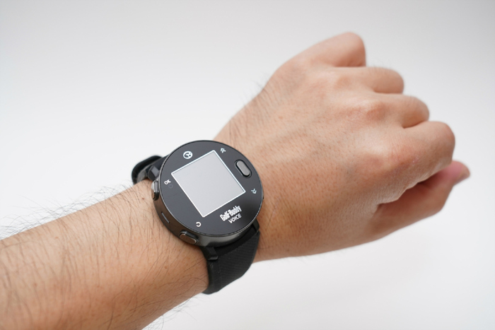 손목에 착용한 모습. 흑백 디스플레이로 풀컬러 디스플레이 제품에 비해 화면 구성은 단조롭지만 햇빛이 강한 대낮에도 시인성은 우수하다. 전 세계 170여개국의 4만여개 골프장 코스가 탑재되어있는 덕분에 국내 골프 라운딩 뿐만 아니라 해외 골프장에서도 유용하게 활용할 수 있고 추후 업데이트 되는 코스 다운로드 또한 무료로 부담없다.