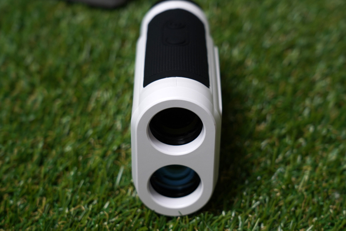 상단에 전원 및 측정버튼, 단위 변환 버튼이 위치하며, 오른쪽에는 스피커와 충전 단자가 구성되어있다. 대부분의 레이저 골프 거리 측정기가 단순한 측정만 지원하는 것과 달리 디스플레이를 통한 출력 및 음성 안내가 지원되는 것이 특징이다.